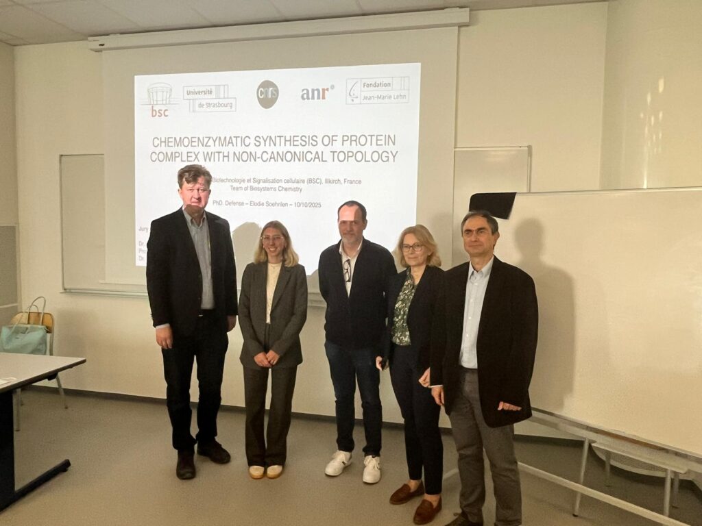 Congratulations to Élodie Soehnlen who successfully defended her PhD thesis!  Special thanks to jury members Sophie Faure, Olivier Lequin and Frédéric Bihel (10 October 2025).